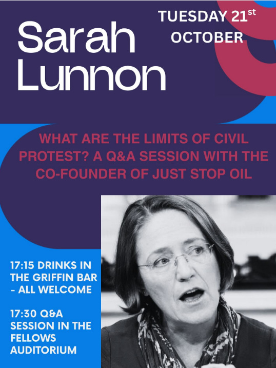 We are kicking off this year’s speakers events with a high-profile climate activist. Sarah Lunnon has a background as a Green Party councillor and has been a coordinator and representative of Extinction Rebellion and Insulate Britain. Lunnon is also the co-founder of Just Stop Oil. She is a powerful speaker, having interviewed on the BBC, This Morning, LBC and Sky News. Lunnon’s message that the urgency of the climate crisis necessitates what many would consider radical and extreme methods of civil disobedience has provoked much discussion.